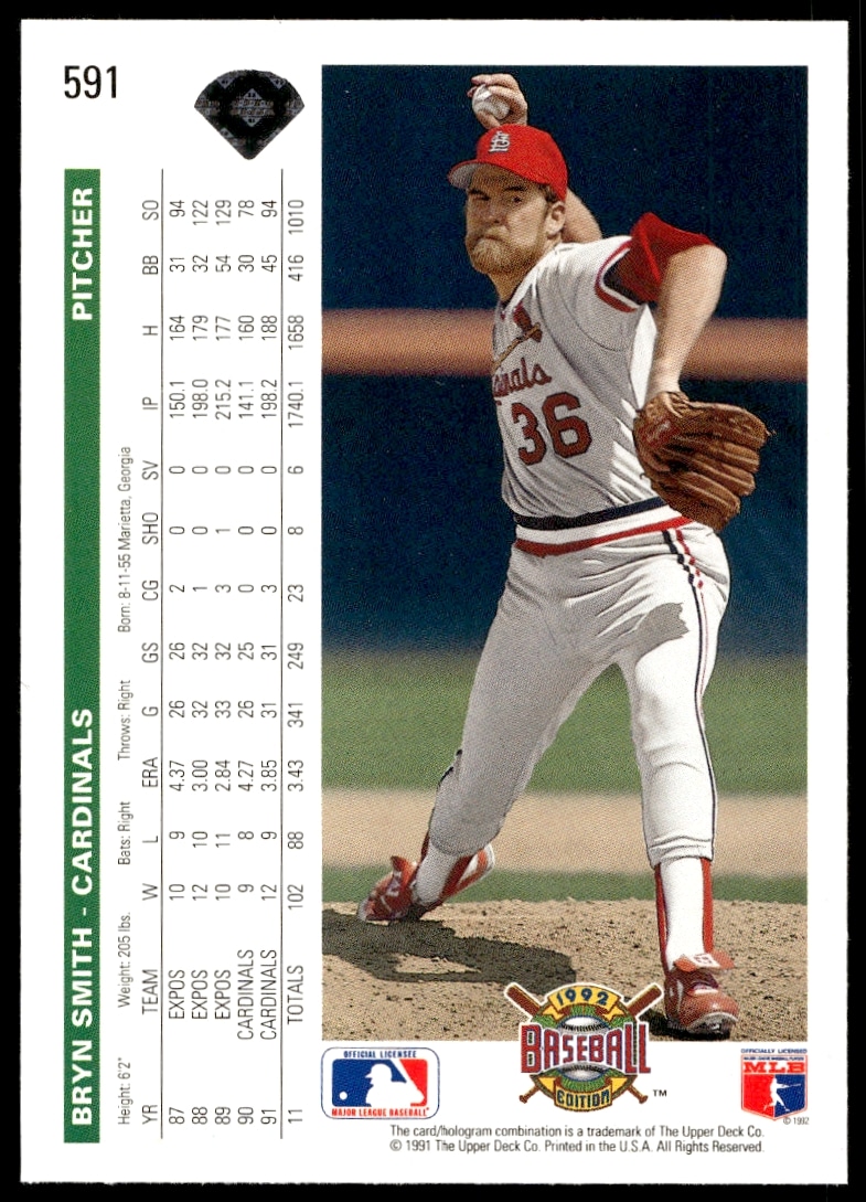This Baseball card, from 1992 is part of the Upper Deck card set. Bryn Smith is featured and has a card number of 591.