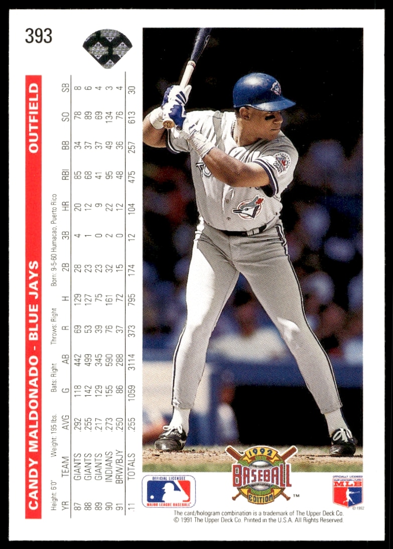 This Baseball card, from 1992 is part of the Upper Deck card set. Candy Maldonado is featured and has a card number of 393.