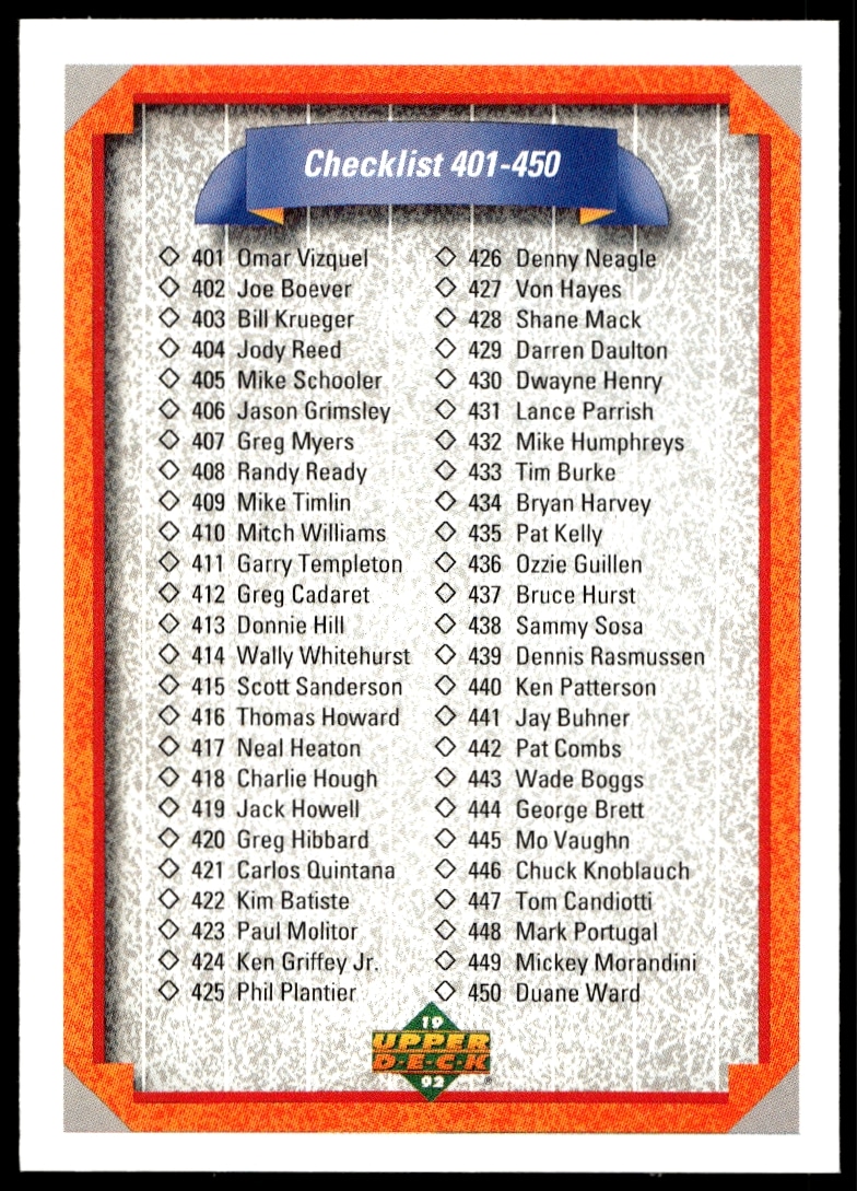 This Baseball card, from 1992 is part of the Upper Deck card set. Checklist: 401 – 500 is featured and has a card number of 500.
