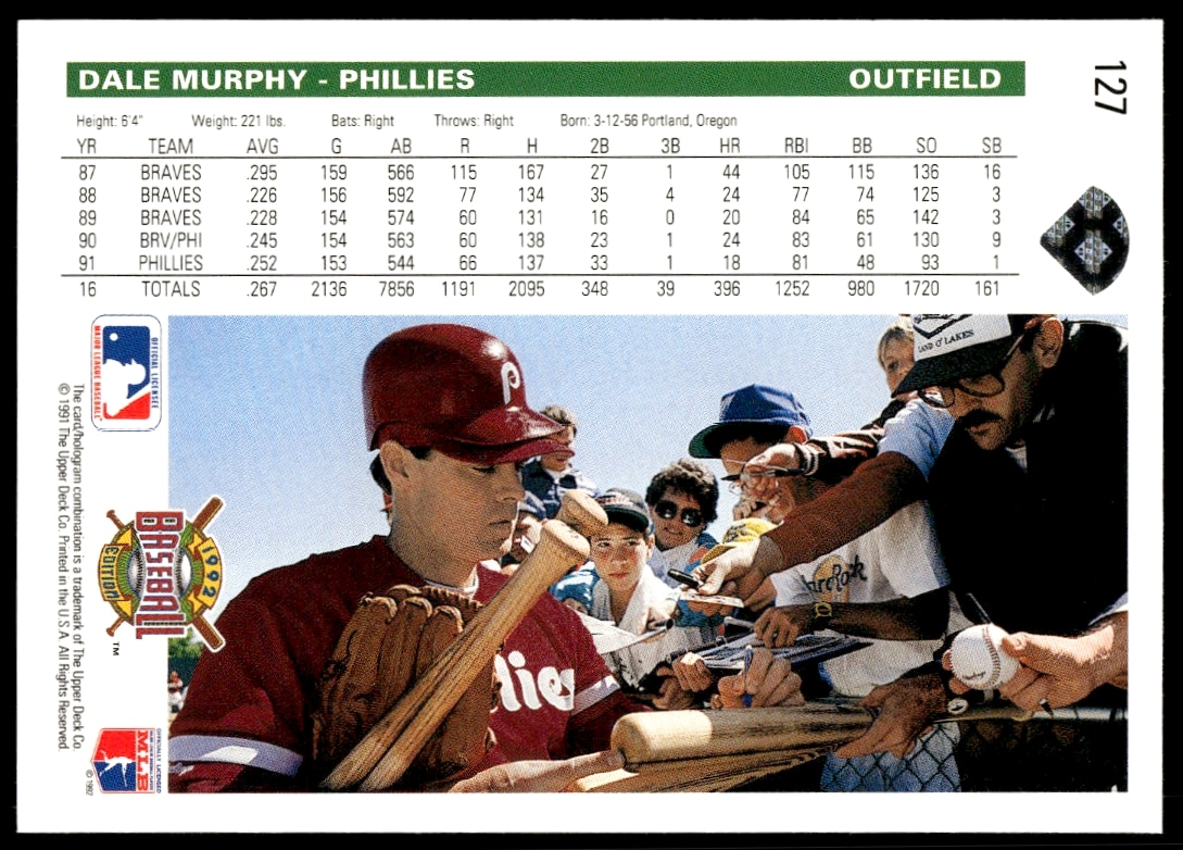 This Baseball card, from 1992 is part of the Upper Deck card set. Dale Murphy is featured and has a card number of 127.