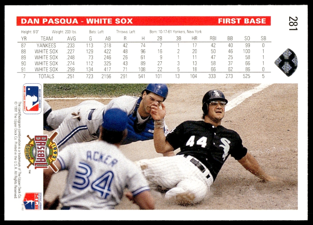 This Baseball card, from 1992 is part of the Upper Deck card set. Dan Pasqua is featured and has a card number of 281.