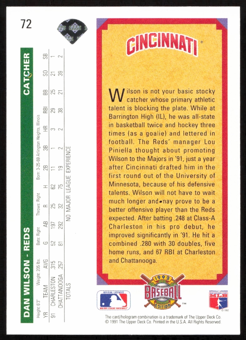 This Baseball card, from 1992 is part of the Upper Deck card set. Dan Wilson is featured and has a card number of 72.