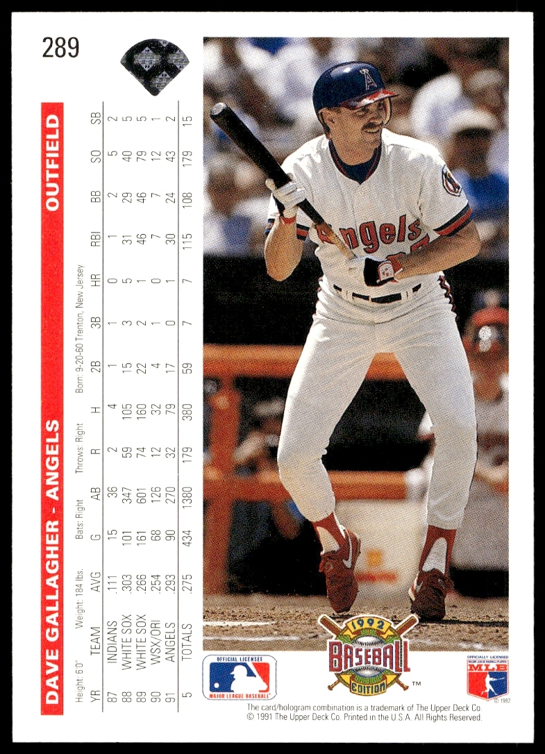 This Baseball card, from 1992 is part of the Upper Deck card set. Dave Gallagher is featured and has a card number of 289.