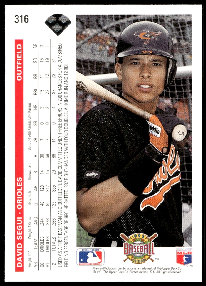 This Baseball card, from 1992 is part of the Upper Deck card set. David Segui is featured and has a card number of 316.