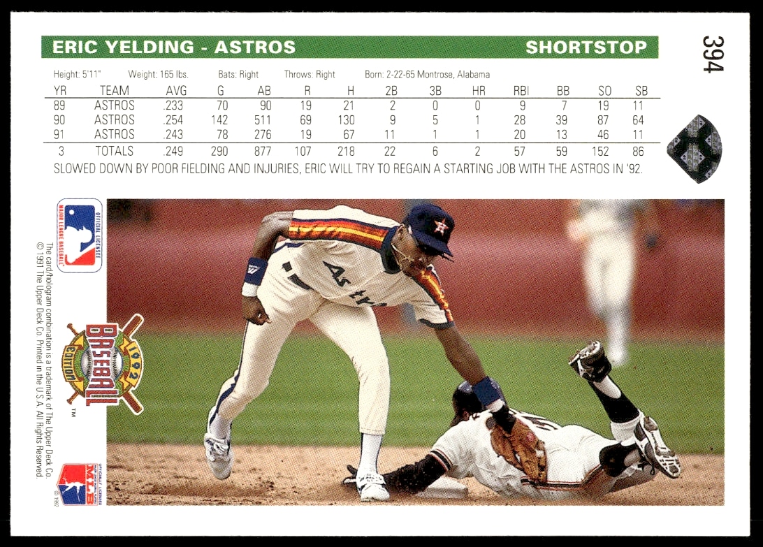 This Baseball card, from 1992 is part of the Upper Deck card set. Eric Yelding is featured and has a card number of 394.