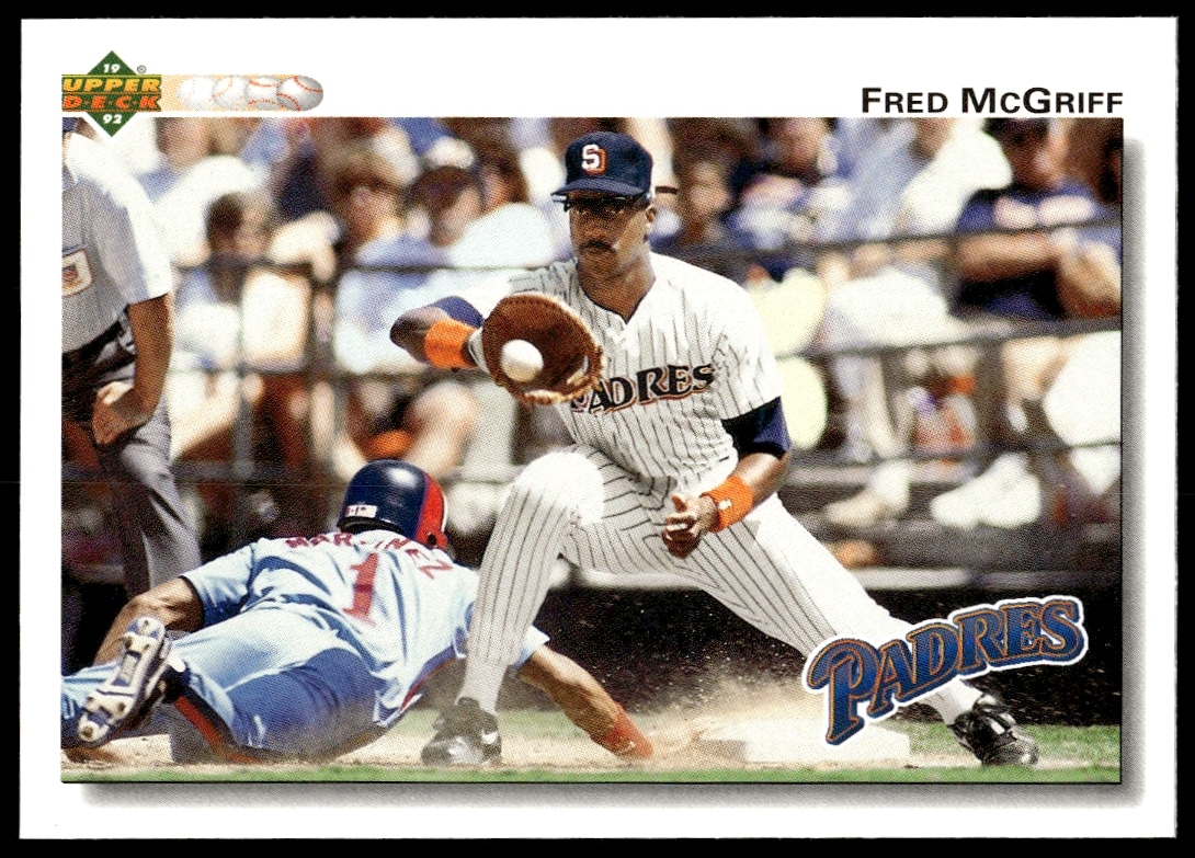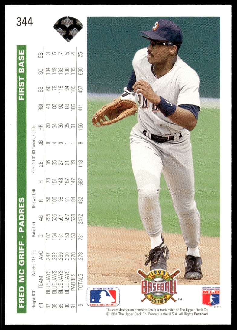 This Baseball card, from 1992 is part of the Upper Deck card set. Fred McGriff is featured and has a card number of 344.