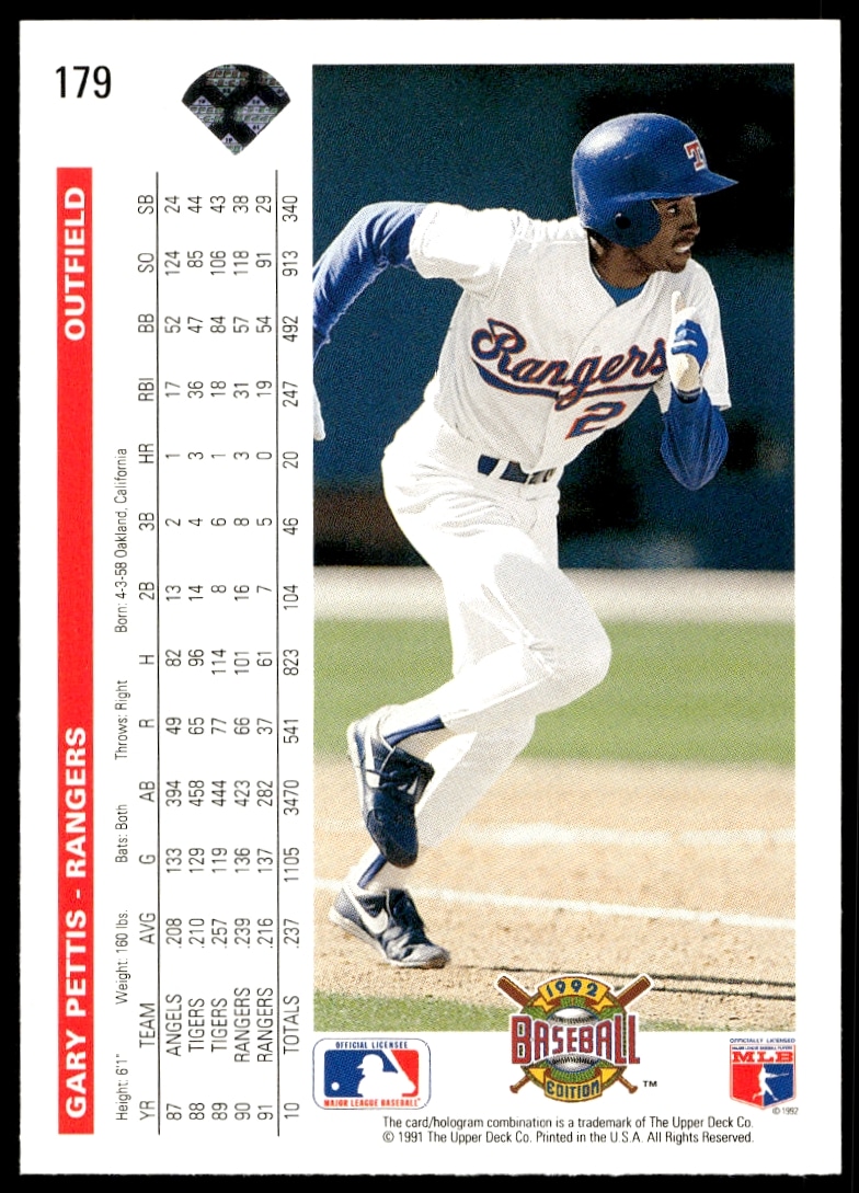 This Baseball card, from 1992 is part of the Upper Deck card set. Gary Pettis is featured and has a card number of 179.