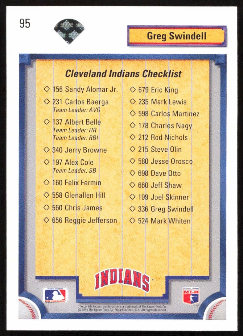This Baseball card, from 1992 is part of the Upper Deck card set. Greg Swindell is featured and has a card number of 95.