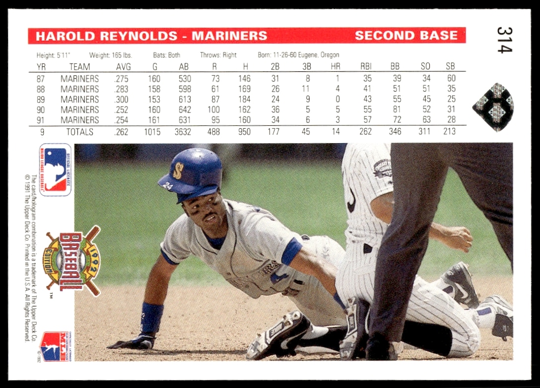 This Baseball card, from 1992 is part of the Upper Deck card set. Harold Reynolds is featured and has a card number of 314.