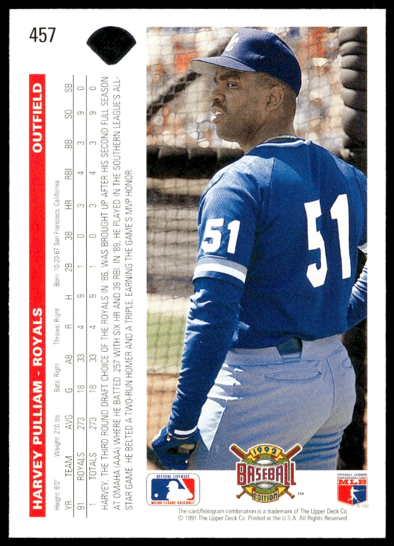 This Baseball card, from 1992 is part of the Upper Deck card set. Harvey Pulliam is featured and has a card number of 457.