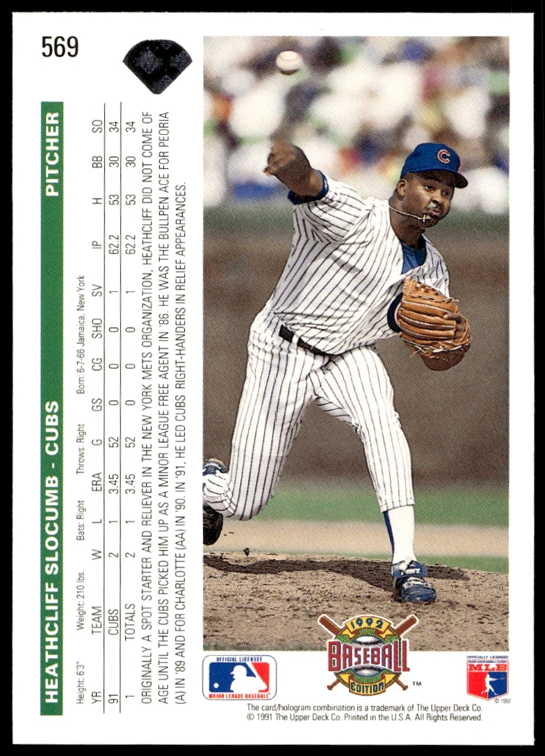 This Baseball card, from 1992 is part of the Upper Deck card set. Heathcliff Slocumb is featured and has a card number of 569.