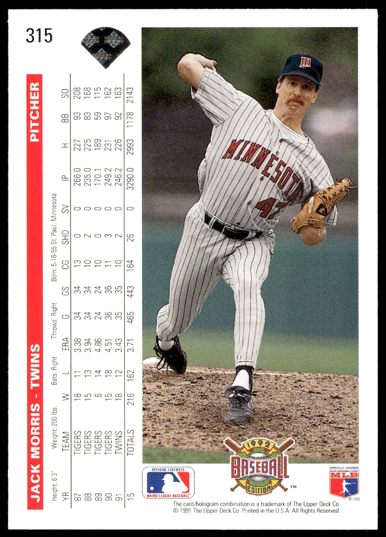 This Baseball card, from 1992 is part of the Upper Deck card set. Jack Morris is featured and has a card number of 315.