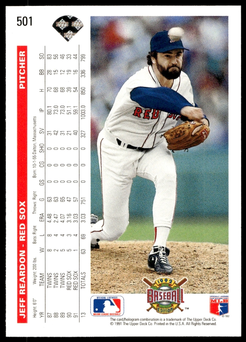 This Baseball card, from 1992 is part of the Upper Deck card set. Jeff Reardon is featured and has a card number of 501.