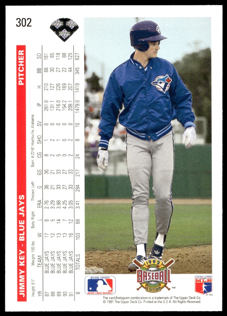 This Baseball card, from 1992 is part of the Upper Deck card set. Jimmy Key is featured and has a card number of 302.