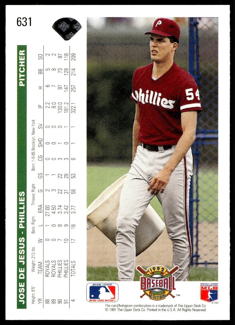 This Baseball card, from 1992 is part of the Upper Deck card set. Jose DeJesus is featured and has a card number of 631.