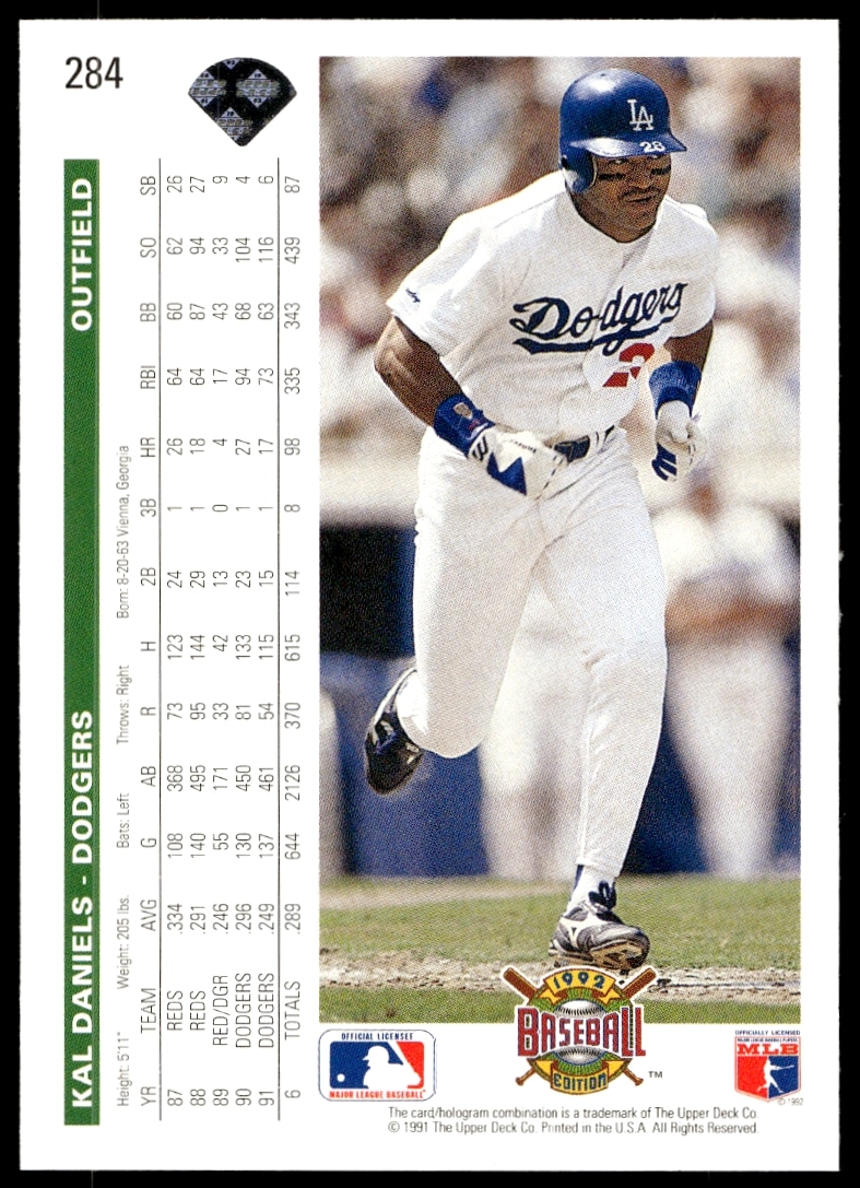 This Baseball card, from 1992 is part of the Upper Deck card set. Kal Daniels is featured and has a card number of 284.