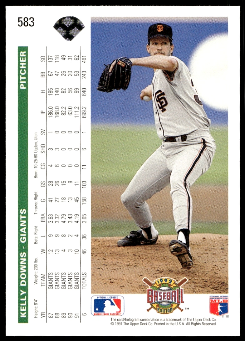 This Baseball card, from 1992 is part of the Upper Deck card set. Kelly Downs is featured and has a card number of 583.