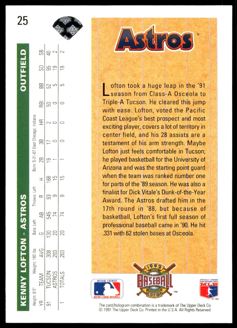 This Baseball card, from 1992 is part of the Upper Deck card set. Kenny Lofton is featured and has a card number of 25.