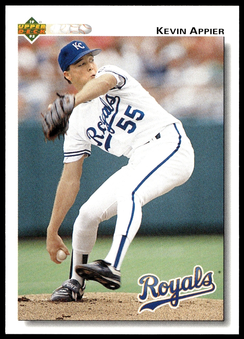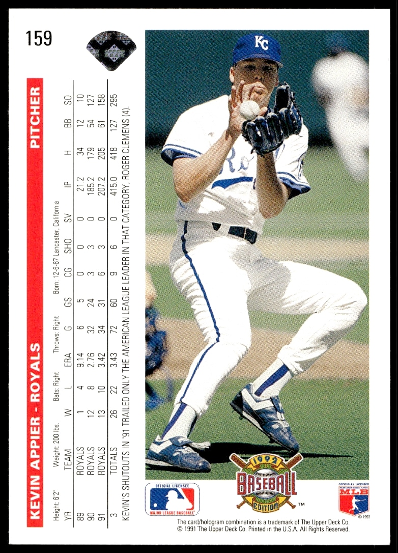 This Baseball card, from 1992 is part of the Upper Deck card set. Kevin Appier is featured and has a card number of 159.