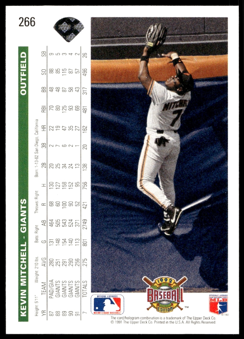 This Baseball card, from 1992 is part of the Upper Deck card set. Kevin Mitchell is featured and has a card number of 266.