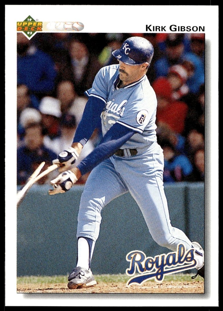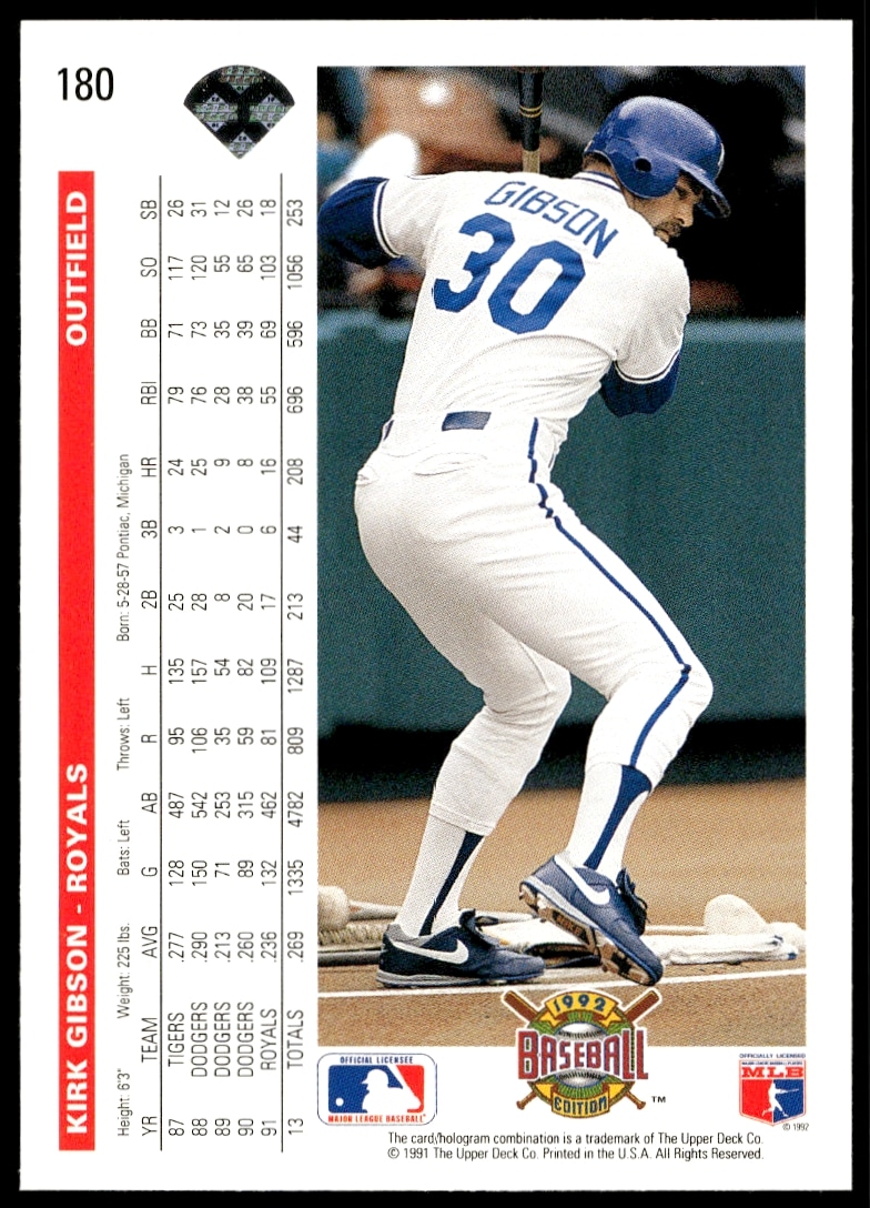 This Baseball card, from 1992 is part of the Upper Deck card set. Kirk Gibson is featured and has a card number of 180.