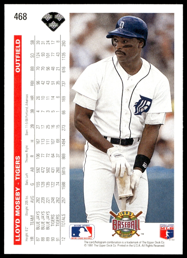 This Baseball card, from 1992 is part of the Upper Deck card set. Lloyd Moseby is featured and has a card number of 468.