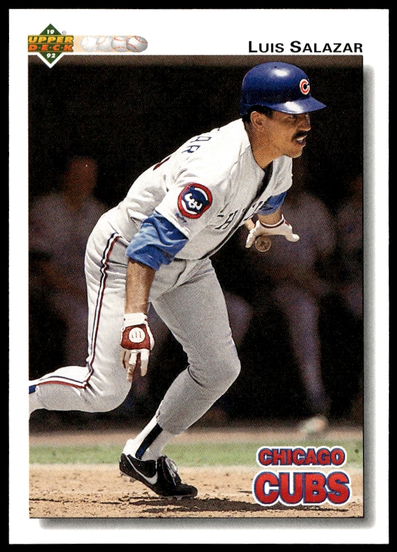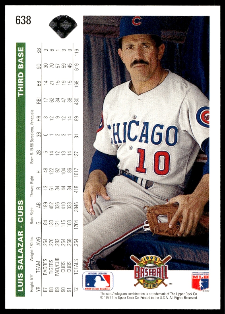 This Baseball card, from 1992 is part of the Upper Deck card set. Luis Salazar is featured and has a card number of 638.
