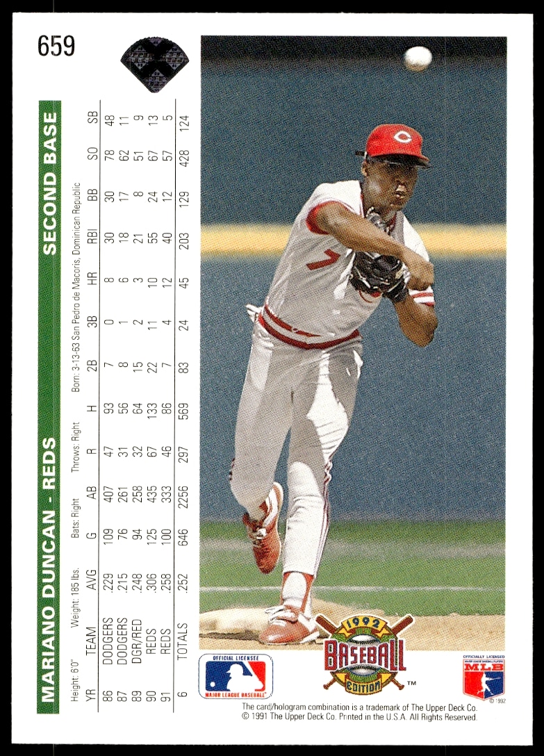 This Baseball card, from 1992 is part of the Upper Deck card set. Mariano Duncan is featured and has a card number of 659.