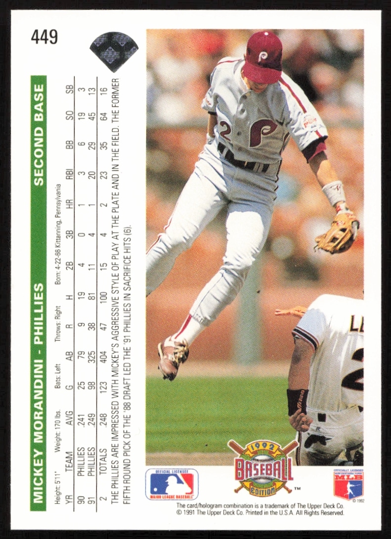 This Baseball card, from 1992 is part of the Upper Deck card set. Mickey Morandini is featured and has a card number of 449.