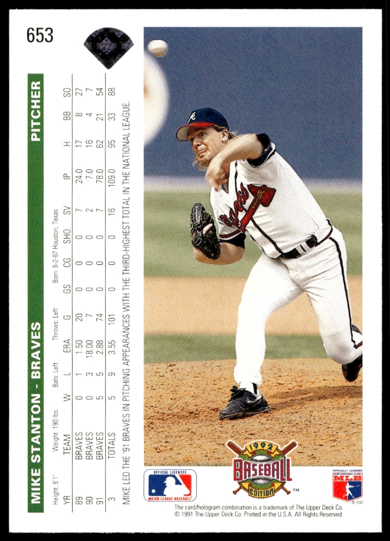 This Baseball card, from 1992 is part of the Upper Deck card set. Mike Stanton is featured and has a card number of 653.