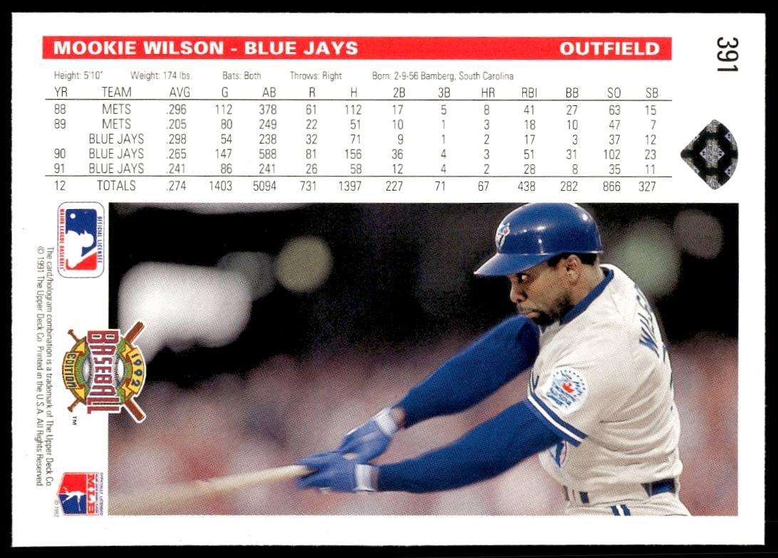 This Baseball card, from 1992 is part of the Upper Deck card set. Mookie Wilson is featured and has a card number of 391.