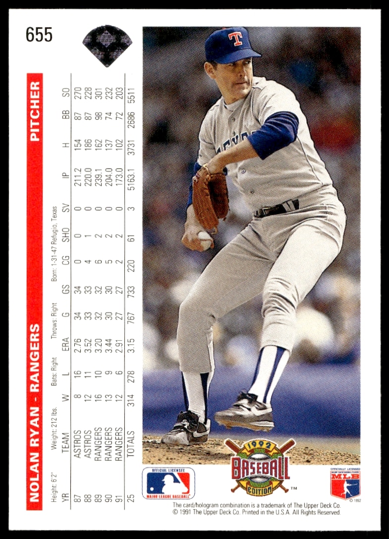 This Baseball card, from 1992 is part of the Upper Deck card set. Nolan Ryan is featured and has a card number of 655.
