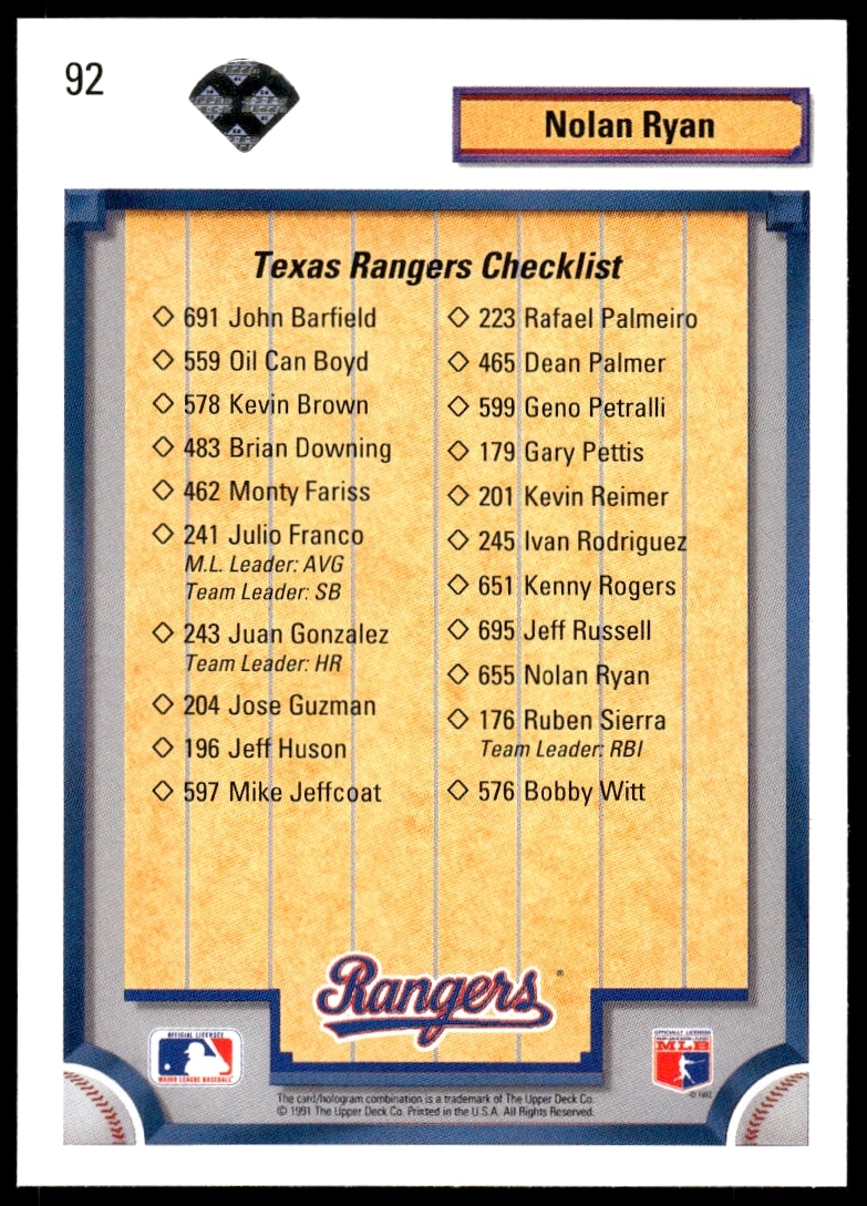 1992 Upper Deck Nolan Ryan Checklist #92