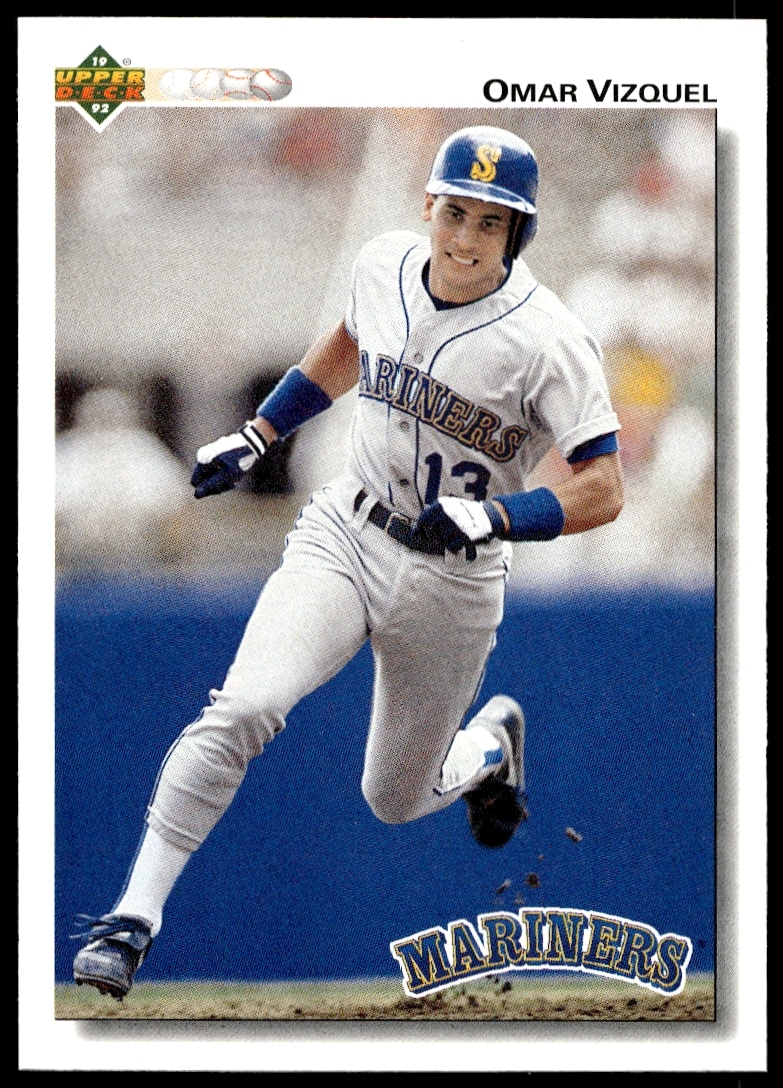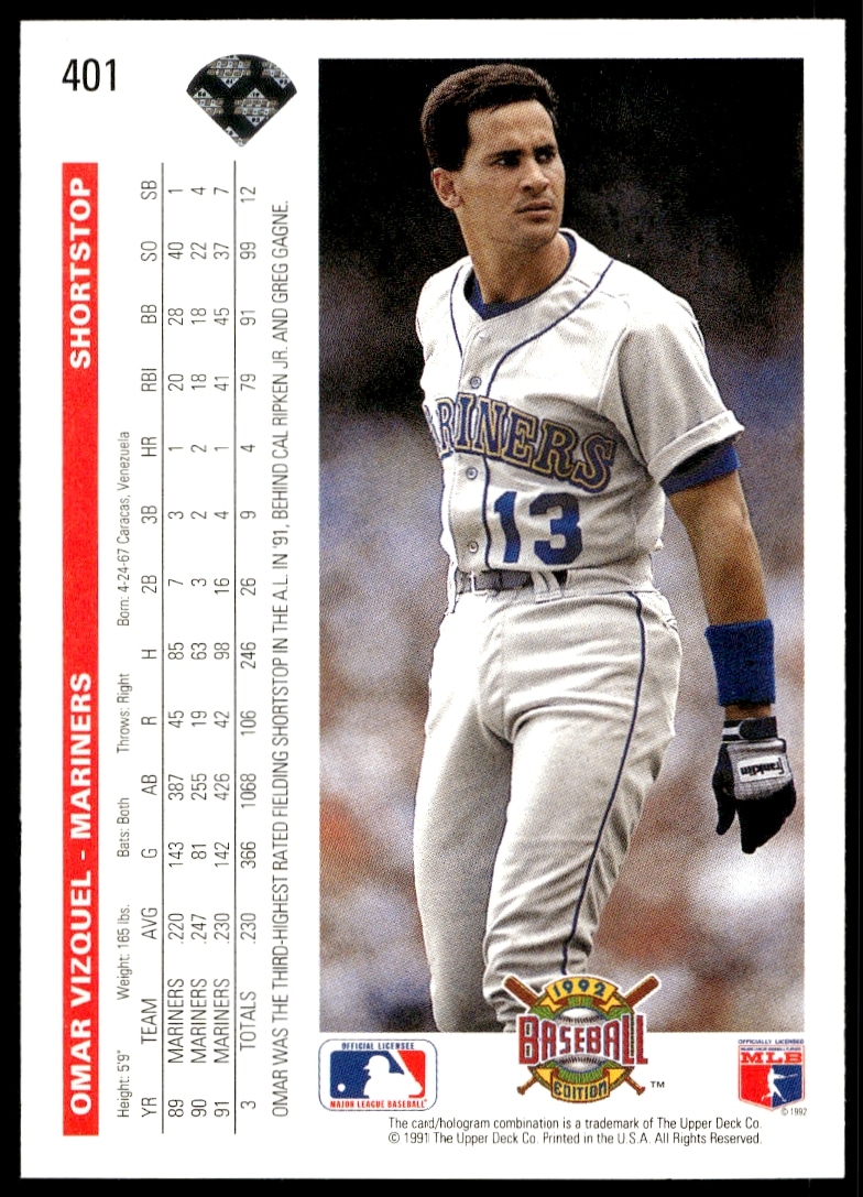 This Baseball card, from 1992 is part of the Upper Deck card set. Omar Vizquel is featured and has a card number of 401.