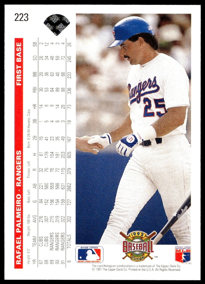 This Baseball card, from 1992 is part of the Upper Deck card set. Rafael Palmeiro is featured and has a card number of 223.