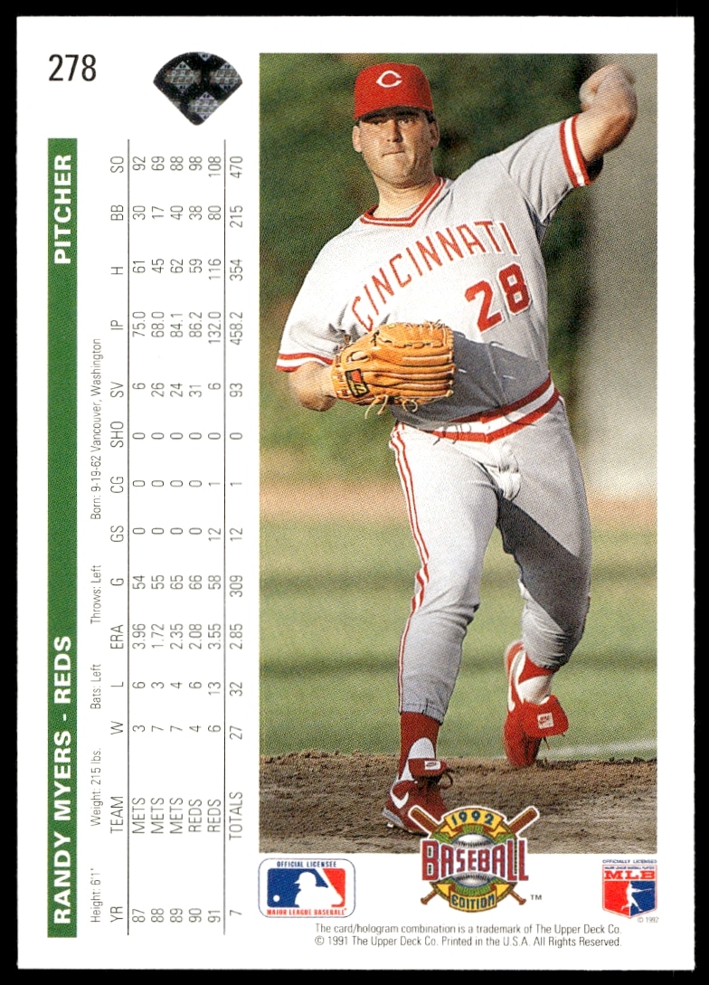 This Baseball card, from 1992 is part of the Upper Deck card set. Randy Myers is featured and has a card number of 278.
