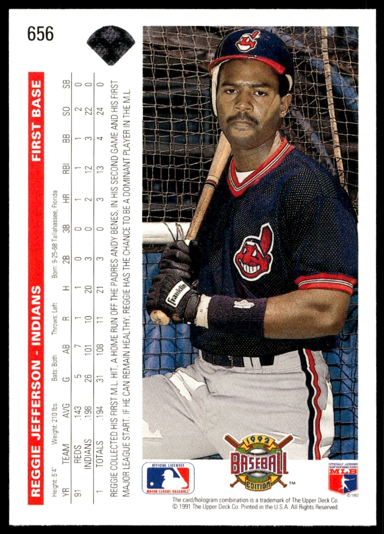 This Baseball card, from 1992 is part of the Upper Deck card set. Reggie Jefferson is featured and has a card number of 656.