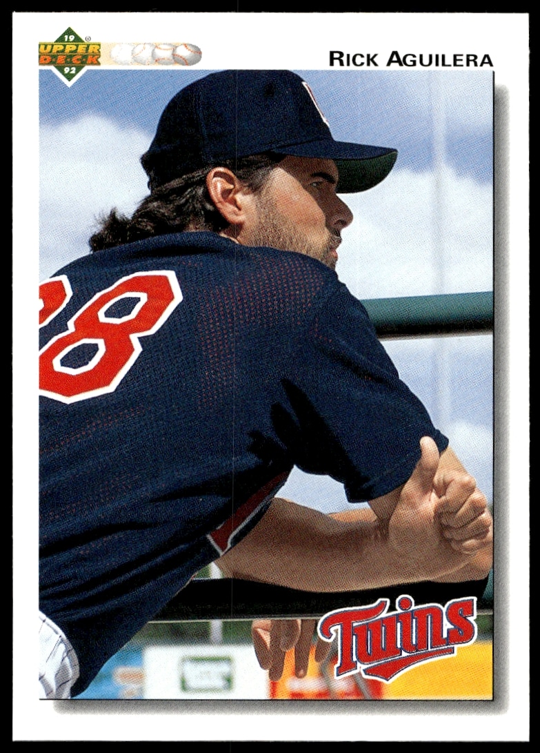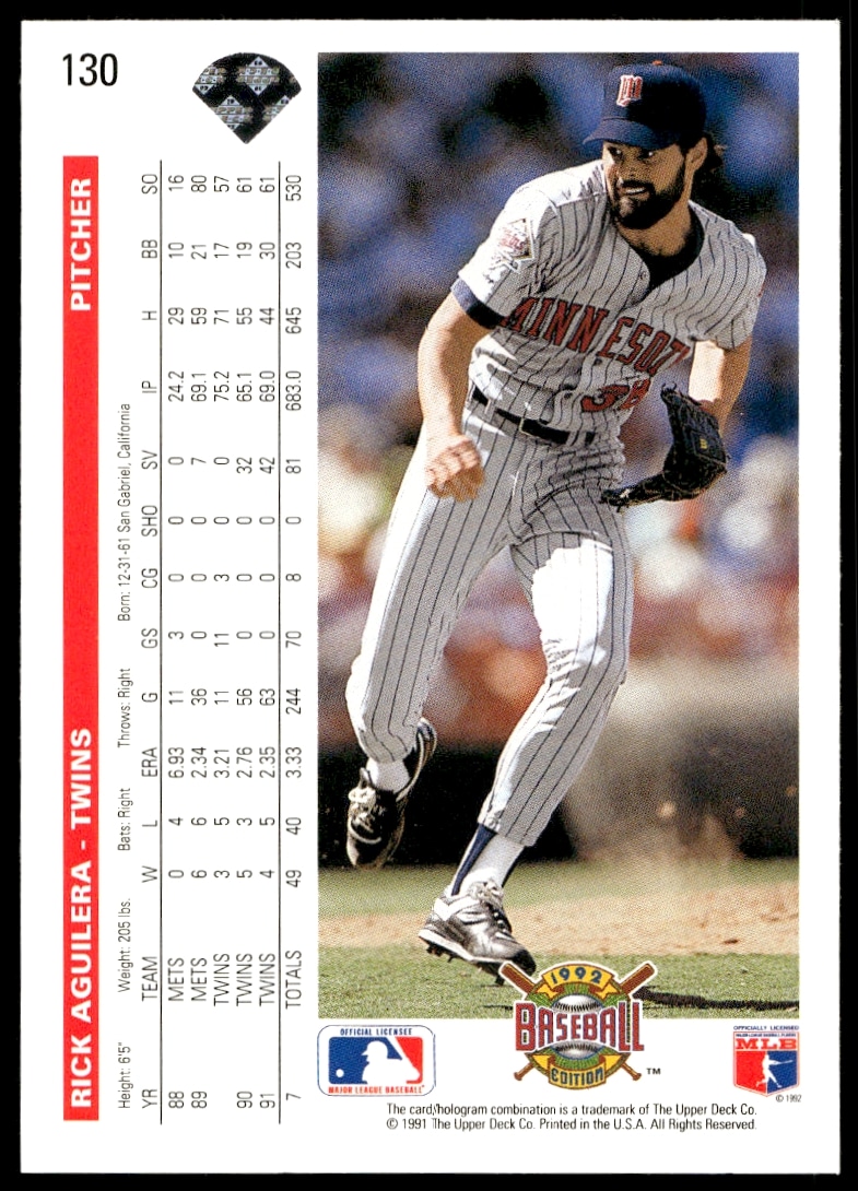This Baseball card, from 1992 is part of the Upper Deck card set. Rick Aguilera is featured and has a card number of 130.