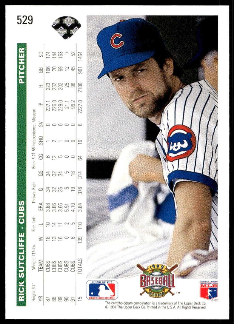 This Baseball card, from 1992 is part of the Upper Deck card set. Rick Sutcliffe is featured and has a card number of 529.