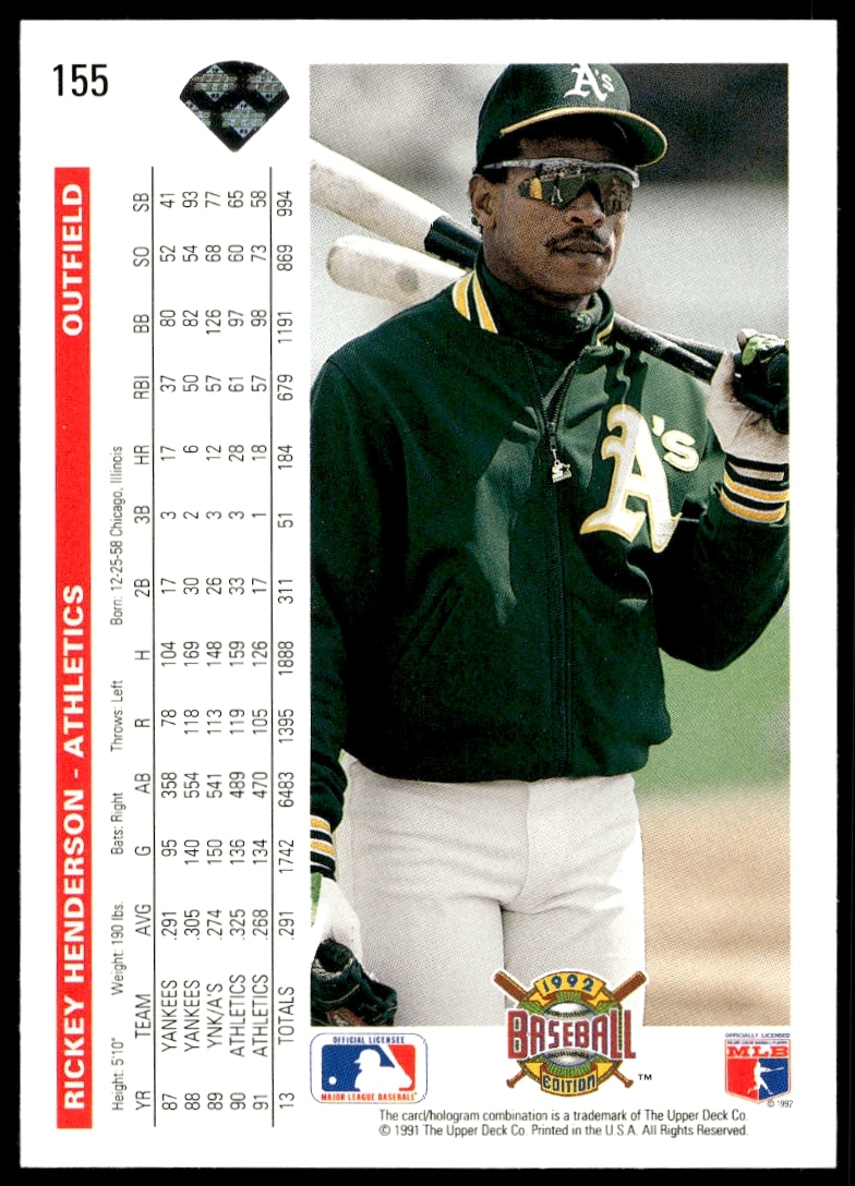 This Baseball card, from 1992 is part of the Upper Deck card set. Rickey Henderson is featured and has a card number of 155.