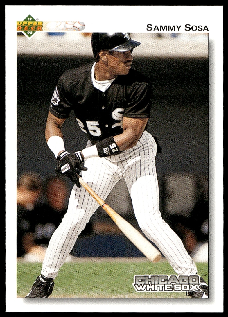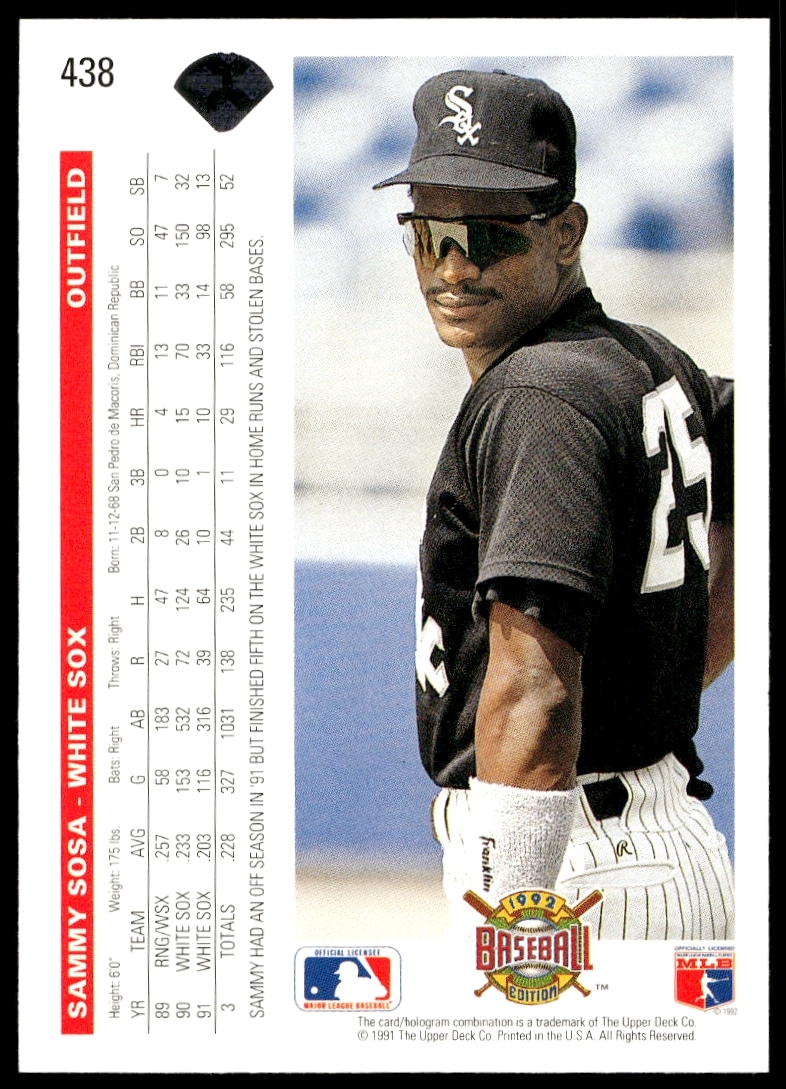 This Baseball card, from 1992 is part of the Upper Deck card set. Sammy Sosa is featured and has a card number of 438.