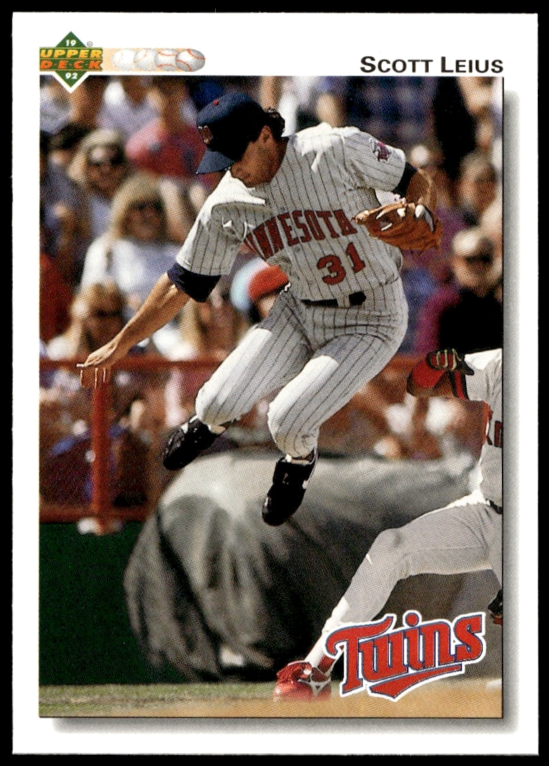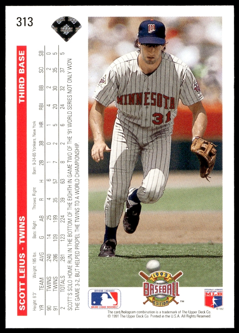 This Baseball card, from 1992 is part of the Upper Deck card set. Scott Leius is featured and has a card number of 313.