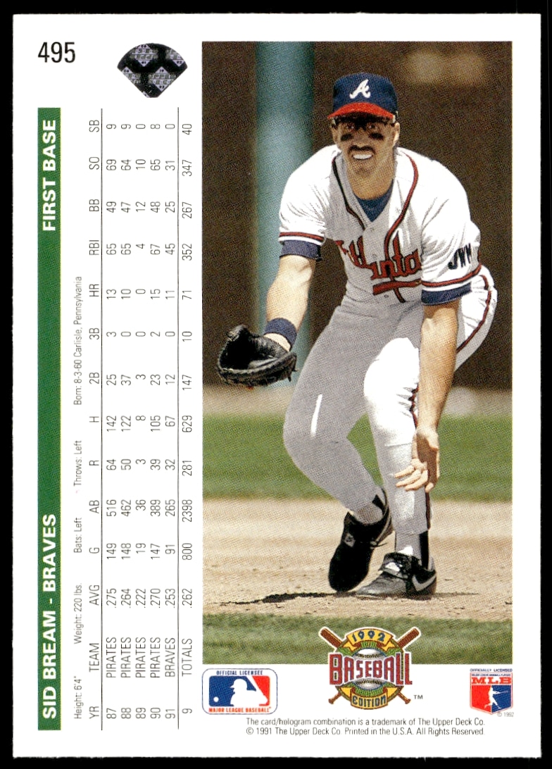 This Baseball card, from 1992 is part of the Upper Deck card set. Sid Bream is featured and has a card number of 495.