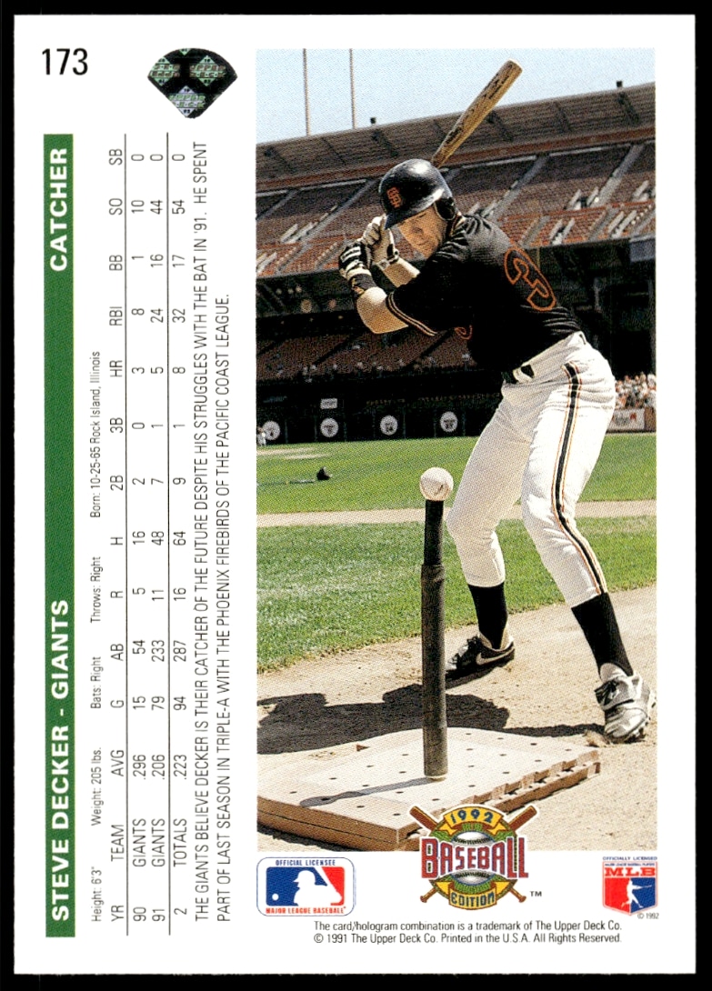 This Baseball card, from 1992 is part of the Upper Deck card set. Steve Decker is featured and has a card number of 173.