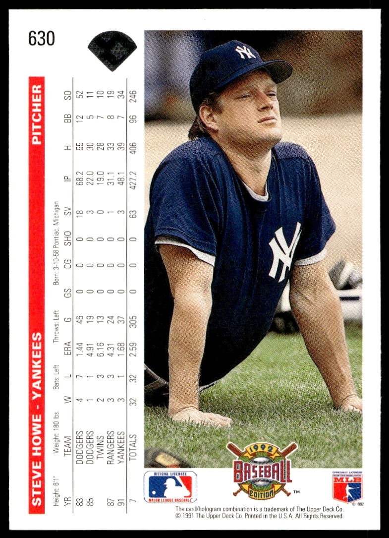 This Baseball card, from 1992 is part of the Upper Deck card set. Steve Howe is featured and has a card number of 630.
