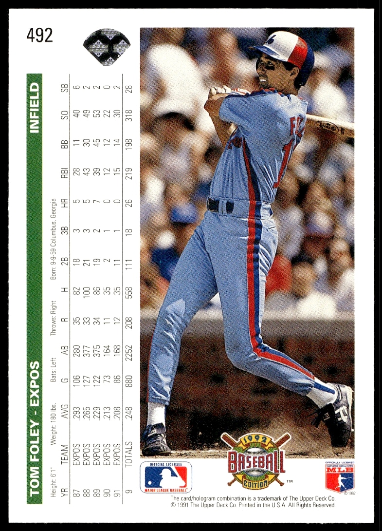 This Baseball card, from 1992 is part of the Upper Deck card set. Tom Foley is featured and has a card number of 492.