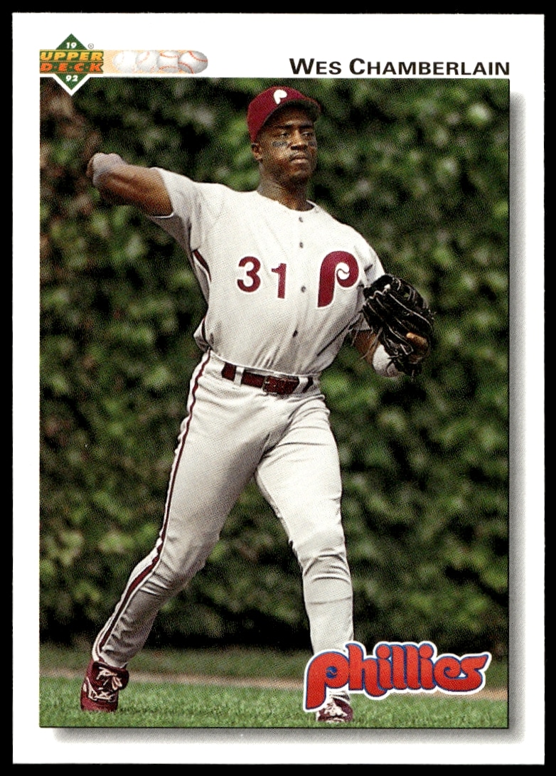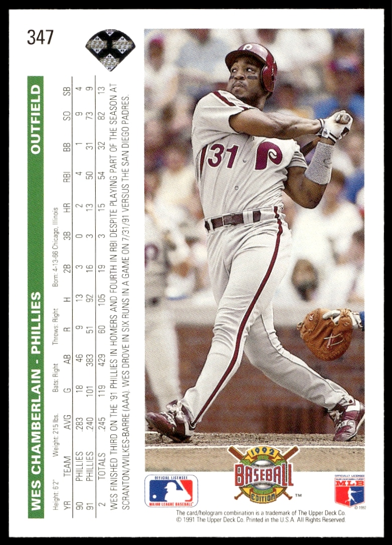 This Baseball card, from 1992 is part of the Upper Deck card set. Wes Chamberlain is featured and has a card number of 347.