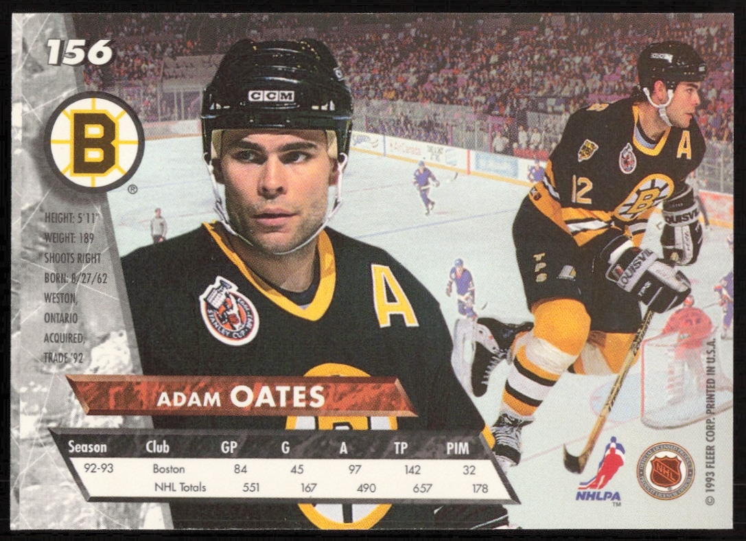 This Hockey card, from 1993-94 is part of the Fleer Ultra card set. Adam Oates is featured and has a card number of 156.