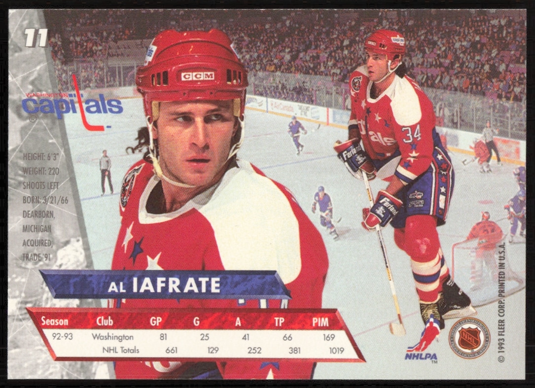 This Hockey card, from 1993-94 is part of the Fleer Ultra card set. Al Iafrate is featured and has a card number of 11.