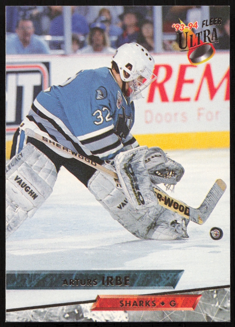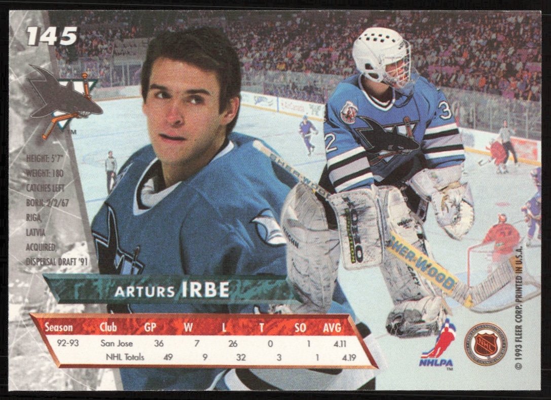 This Hockey card, from 1993-94 is part of the Fleer Ultra card set. Arturs Irbe is featured and has a card number of 145.